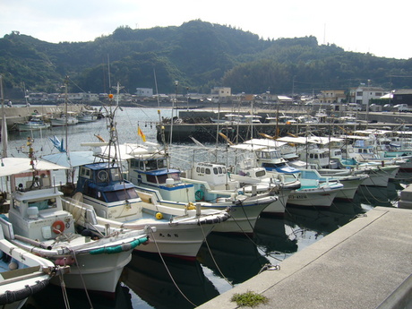 大分市南東部の漁港。南側の山の上から漁港を含む沿岸を俯瞰できる。