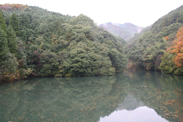 大分市南部にある池。周囲は山や緑に包まれている。