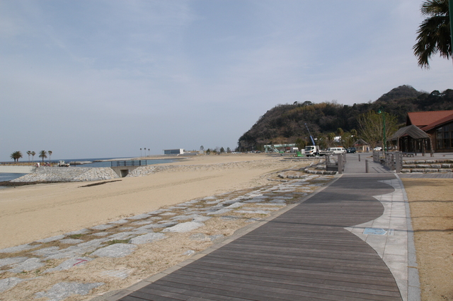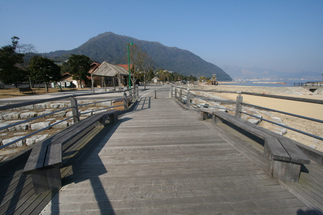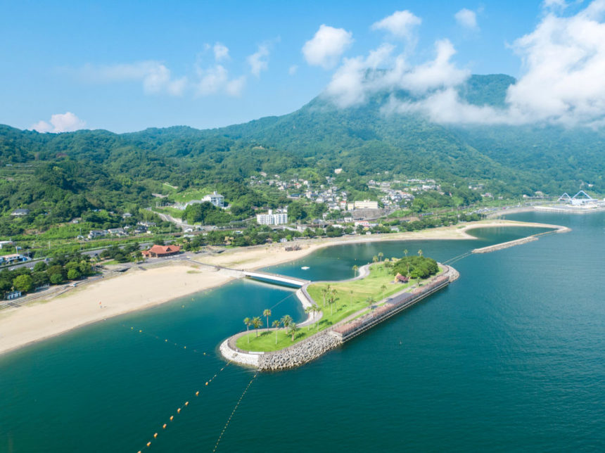 別府湾に面した海水浴場。口を開けたような湾と中央に浮かぶ人工島の織り成す地形が美しい。