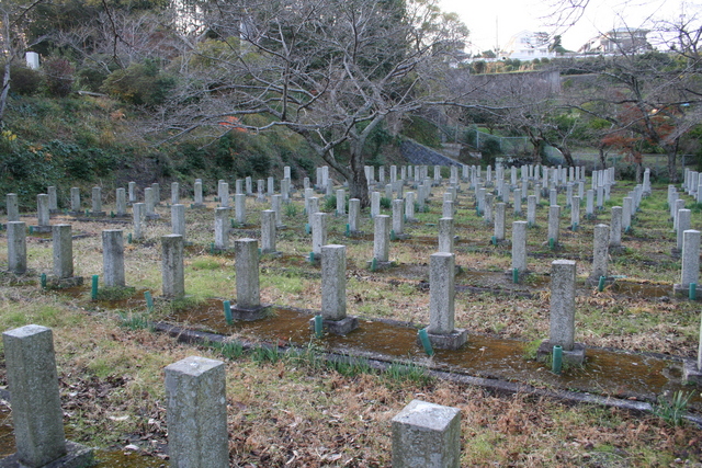 市中心部近郊にある戦没者慰霊施設。多数の墓碑が整然と並んでいる。周囲は住宅団地とみかん畑に囲まれており、眼下に市街地を見下ろすことができる。